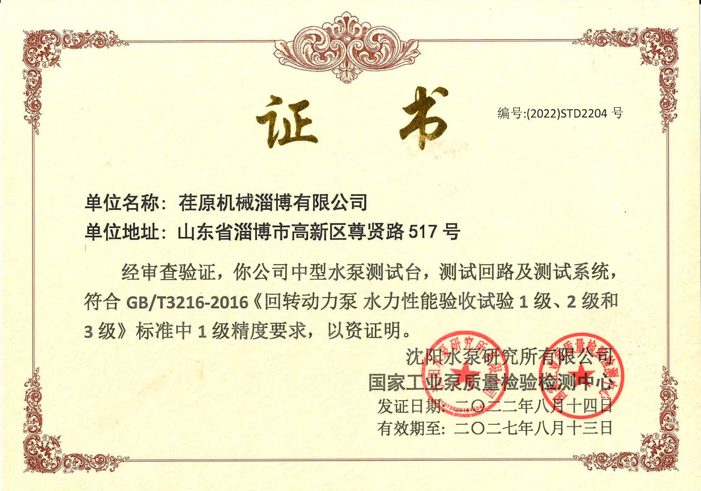 • 中型水泵試驗(yàn)臺及測試系統(tǒng)1級精度證書
