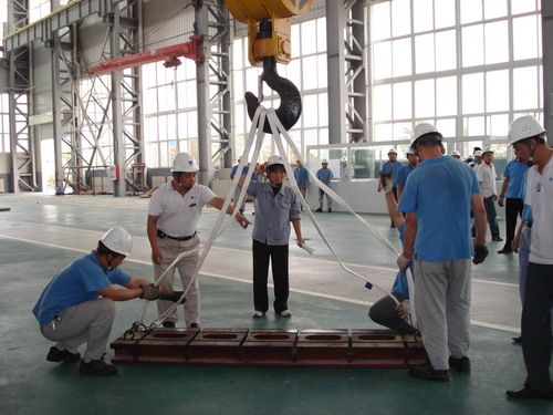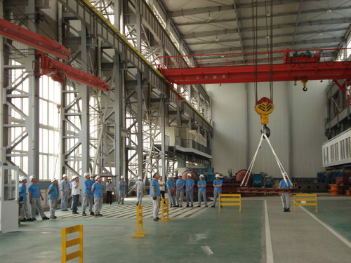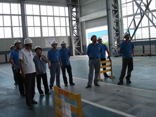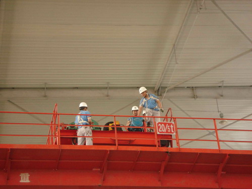 此次預(yù)演活動(dòng)的主要內(nèi)容是,吊車在運(yùn)行過(guò)程中突然停電后工作人員的應(yīng)變能力。演習(xí)開(kāi)始了,首先,停電后吊車工先把開(kāi)關(guān)手柄放置到“零位”并監(jiān)控總電源。同時(shí),生產(chǎn)部裝配班、物流班部分員工在各自科長(zhǎng)的帶領(lǐng)下在吊運(yùn)物件下設(shè)護(hù)欄并監(jiān)護(hù),以防有人誤進(jìn)危險(xiǎn)區(qū)域。其次,生產(chǎn)技術(shù)部維修人員按照安全操作規(guī)程,爬上吊車走臺(tái),盤車移動(dòng)到合適位置然后慢慢拉、合抱閘把物件送回地面。最后,解除危險(xiǎn)。